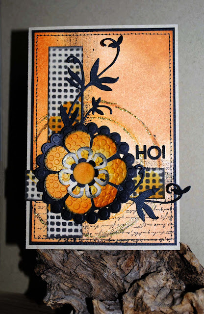 Mooi warme herfstkleuren, prachtige technieken heb je toegepast!! Snap wel niet wat en hoe precies, maar het effect is geweldig mooi!! En die bloem wat een TOPPER, zo mooi!