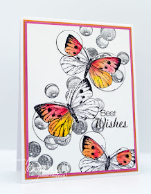 Met de vlinders van Art Journey, de bellen heb ik al lang, geen idee welk merk. De spotlight gedeelten ingekleurd met Zigs, het geheel gemat op 2 kleuren bijpassend cardstock.